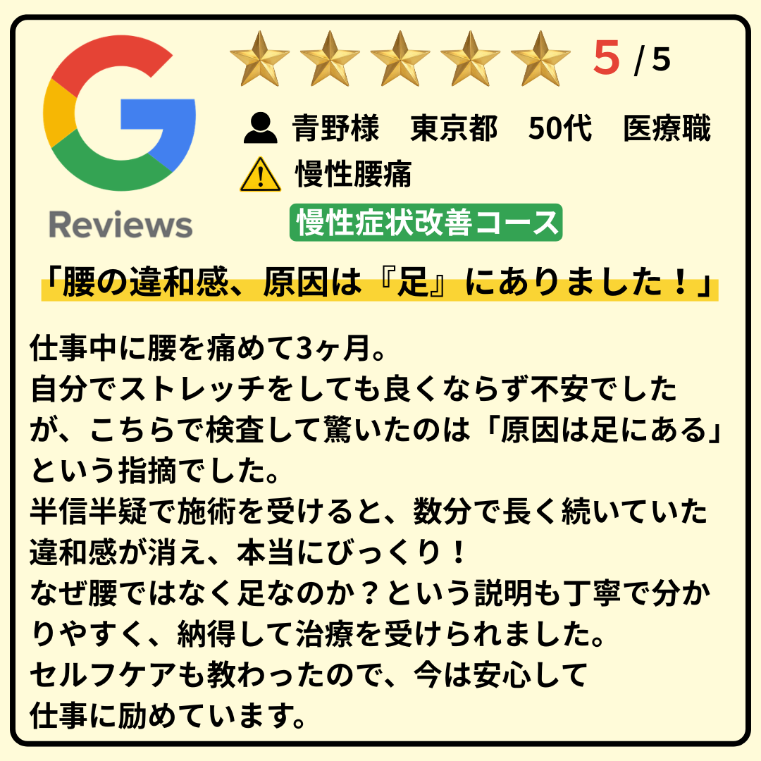 なぜ腰ではなく足なのか?という説明も丁寧で分かりやすく、納得して治療を受けられました。
