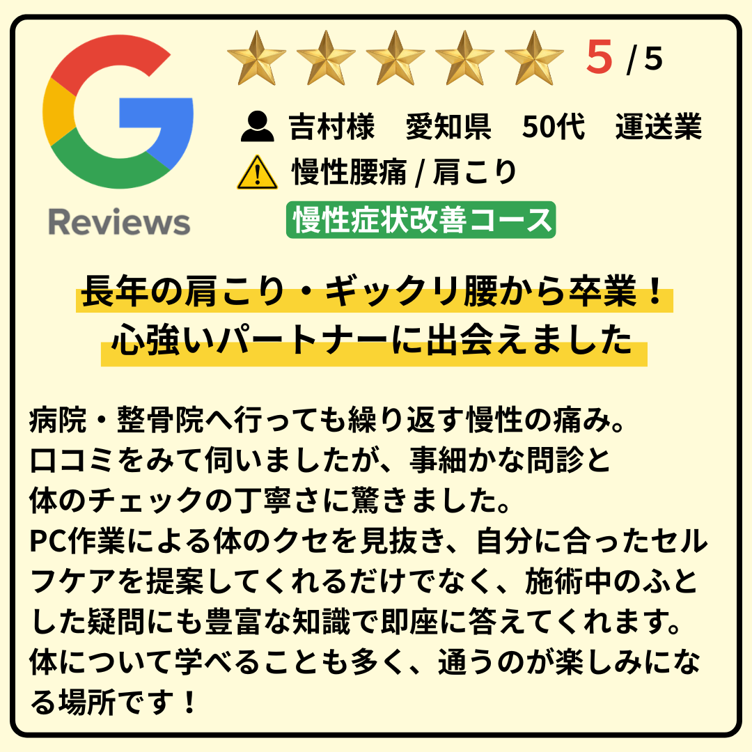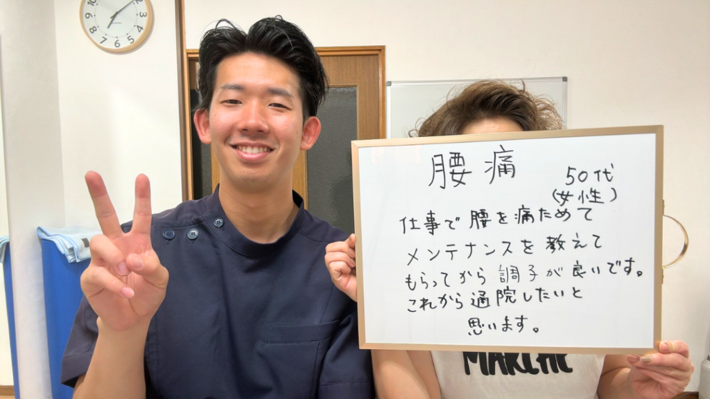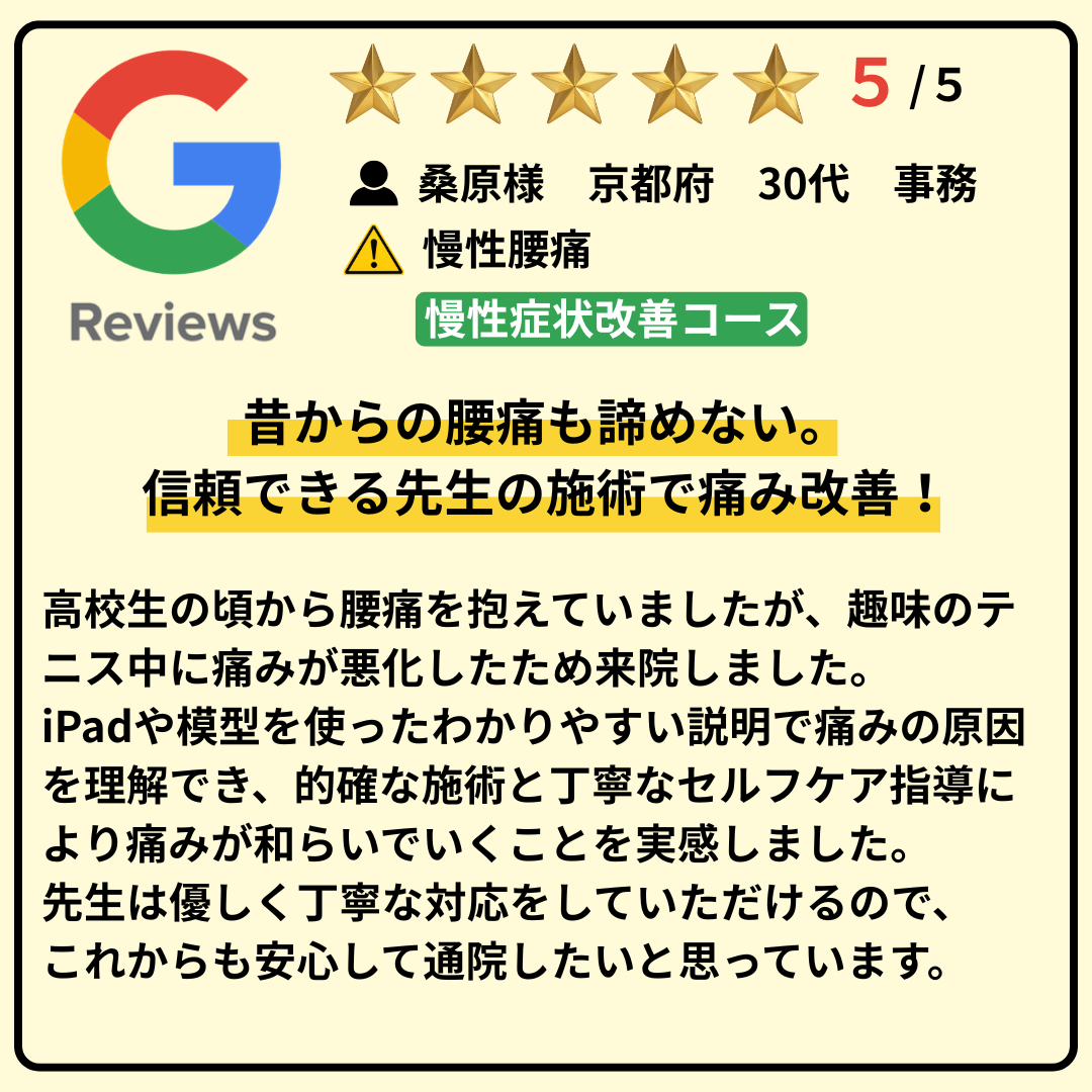 iPadや模型を使ったわかりやすい説明で痛みの原因を理解でき、的確な施術と丁寧なセルフケア指導により痛みが和らいでいくことを実感しました。